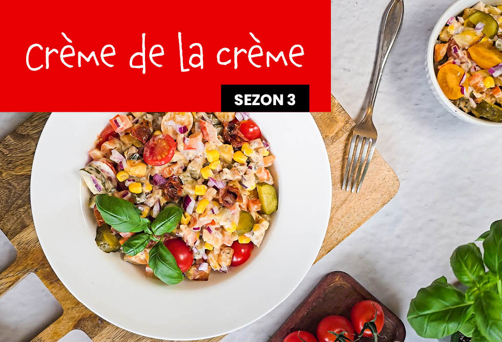 W blenderze zmiksuj jogurt grecki, majonez, suszone pomidory i świeżą bazylię na gładki sos. W dużej misce wymieszaj wszystkie warzywa z opiekanymi ziemniaczkami. Dodaj sos i delikatnie wymieszaj, by wszystko się połączyło.